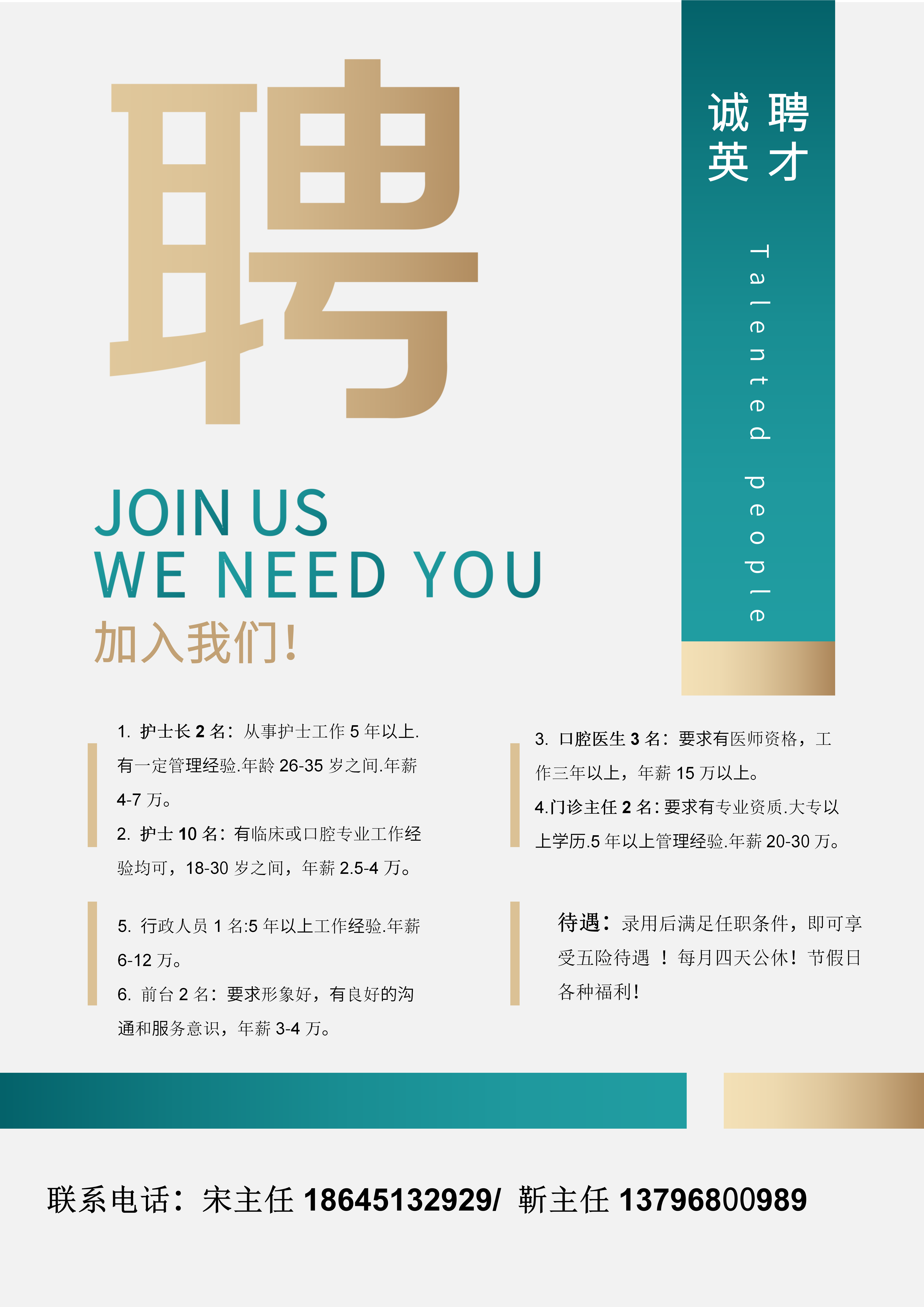 3. 口腔醫(yī)生3名:要求有醫(yī)師資格,工作三年以上,年薪15萬以上。