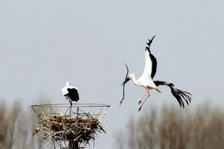 肇東市千鶴島風(fēng)景區(qū)東方白鸛人工鳥巢陸續(xù)架設(shè)搭建完成!