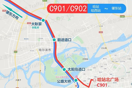肇東至哈市城際公交分為兩條線路。其中,C901路始至哈站,C902路始至哈西站。主要站點(diǎn)途經(jīng)“肇東火車站”、“三道街”站、“大耿家”站、“前進(jìn)道口”站、“太陽(yáng)島...