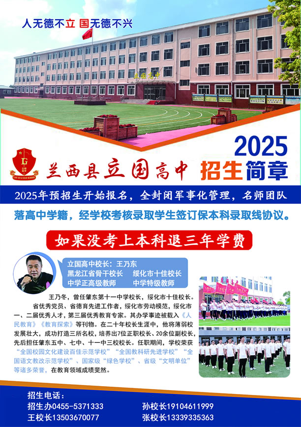 蘭西縣立國藝術(shù)中學,一校區(qū)位于蘭西縣福和城6號樓附近(二校區(qū)待建中),校園占地面積7000平方米。其中綠化面積400平方米,運動場地面積3785平方米。建筑面積3652平方米,其中教學樓3400平方米,警務(wù)室、倉庫(板房)等260平方米。功能室、教育教學設(shè)施齊全,共有領(lǐng)導辦公室6個。功能室16個(包括音、體、美器材室;音、體、美教室;理、化、生實驗室3個及理、化、生實驗準備室儀器室3個、健康體檢室、閱覽室(2個)、圖書室、檔案室、微機室和多功能報告廳)。教學樓還內(nèi)設(shè)財務(wù)室、主控室、儲藏室、衛(wèi)生間。