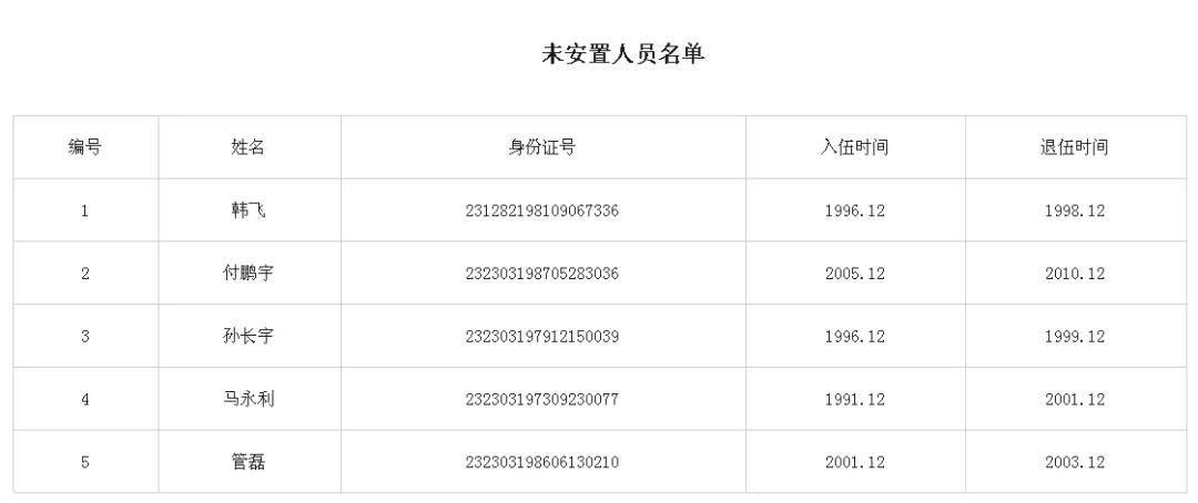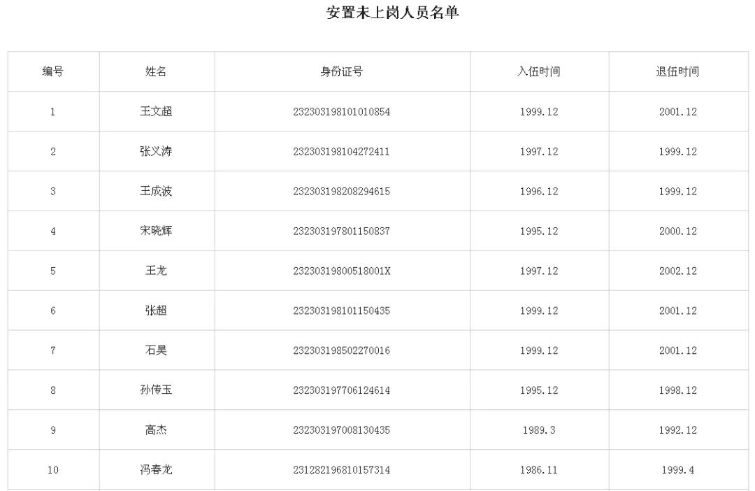 以上人員請于2020年12月31日前,持本人身份證、退伍證原件、檔案由本人保管的提供原件,到肇東市退役軍人事務(wù)局二樓移交安置股辦理安置上崗相關(guān)手續(xù),在規(guī)定時間未報到的按自動放棄處理。