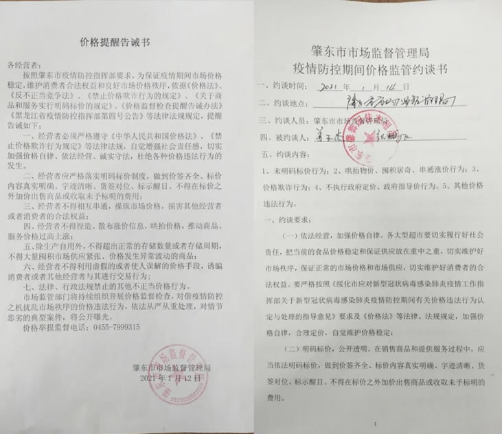 同時(shí),對(duì)全市9個(gè)大中型超市負(fù)責(zé)人進(jìn)行約談,并在《價(jià)格監(jiān)管約談書》上簽字。各基層分局監(jiān)管人員分別深入轄區(qū)經(jīng)營商戶,發(fā)放《價(jià)格提醒告誡書》2200余份,宣傳疫情防控知識(shí)和價(jià)格管理相關(guān)的法律法規(guī),要求各市場主體遵紀(jì)守法,自覺維護(hù)市場秩序,為全市抗擊疫情貢獻(xiàn)自身力量。