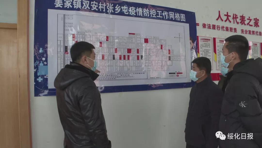 在姜家鎮(zhèn)政府辦公室墻上懸掛的一張姜家鎮(zhèn)雙安村張鄉(xiāng)屯疫情防控工作網(wǎng)格圖格外顯眼。鎮(zhèn)黨委書記生振明指著網(wǎng)格圖,向鎮(zhèn)村干部了解居家隔離人員具體情況。