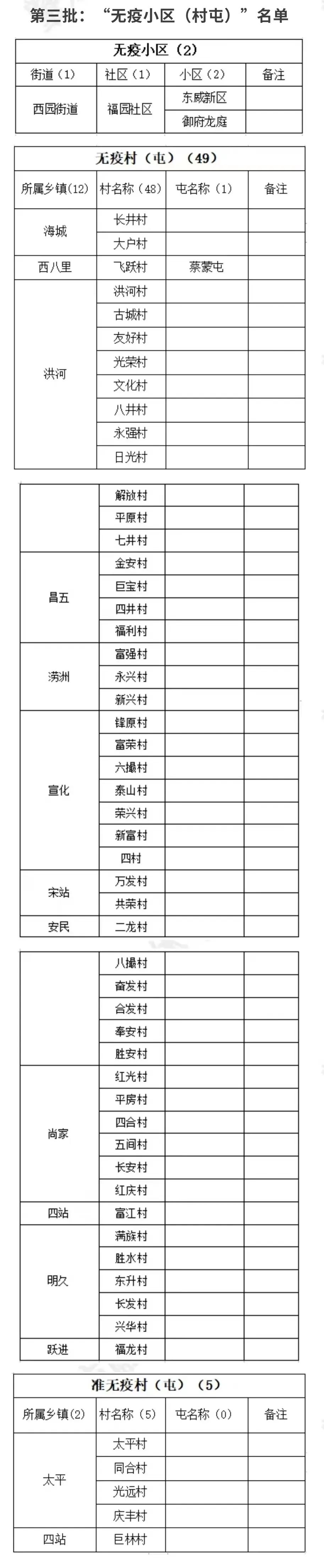 根據(jù)《肇東市“無疫小區(qū)(村屯)”創(chuàng)建工作方案(試行)》,經(jīng)肇東市各社區(qū)(村)申報、街道(鄉(xiāng)鎮(zhèn))審核,市專家組審定,第三批確定2個小區(qū)為“無疫小區(qū)”、49個“無疫村(屯)”、5個“準無疫村(屯)”。