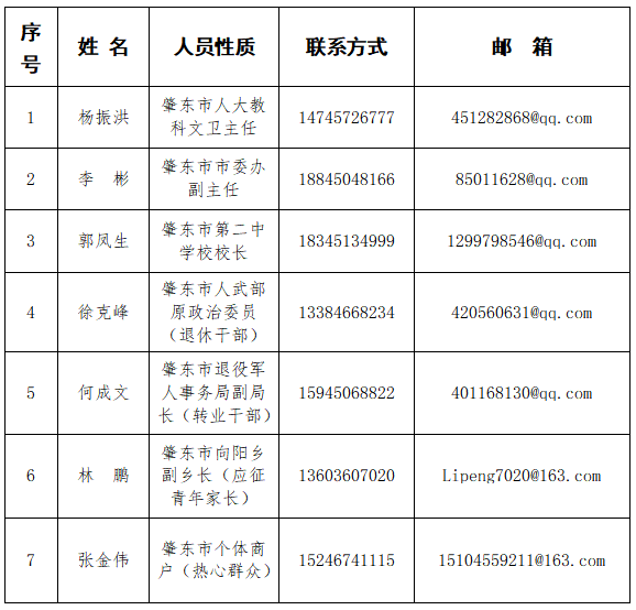 為維護廣大應征青年的合法權益,進一步增強全市征兵工作的透明度,確保征兵工作公開、公平、公正,F(xiàn)將廉潔征兵監(jiān)督員名單予以公示,歡迎社會各界對違反廉潔征兵紀律的行為給予監(jiān)督舉報。