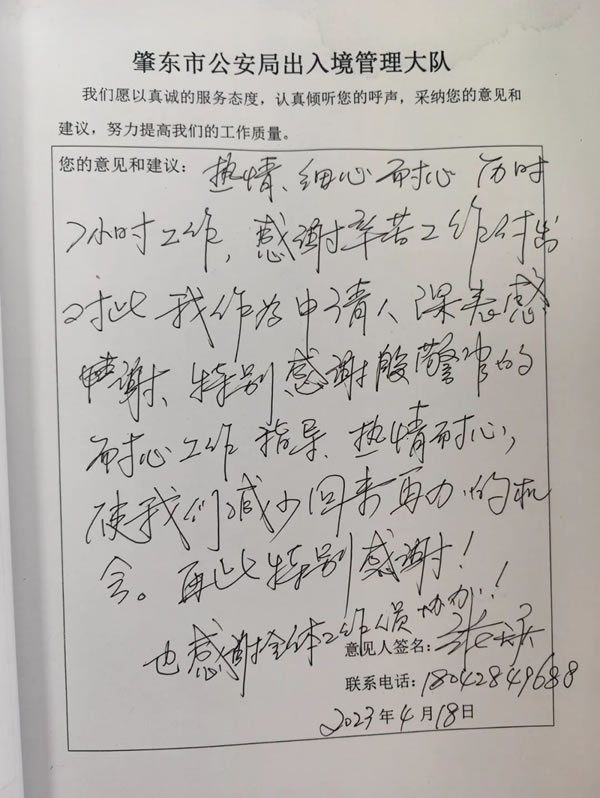 4月18日,從香港返鄉(xiāng)的肇東籍居民張先生攜妻子陳女士來(lái)到肇東市公安局出入境接待大廳,妻子陳女士是香港人,兩人此次是專程飛回來(lái)辦理張先生赴香港定居手續(xù),為了不耽誤二人的返程時(shí)間,辦證民警加班加點(diǎn)忙碌兩個(gè)多小時(shí)為張先生辦理通過(guò)所需辦證材料,張先生感動(dòng)不已,連連說(shuō):“家鄉(xiāng)人太好了,你們出入境民警太暖心了!”當(dāng)即寫(xiě)下一封感謝信表達(dá)心情。