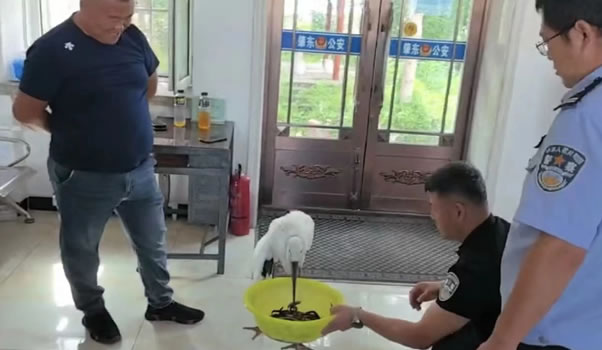 8月28日,躍進鄉(xiāng)福龍村書記宋健來到肇東市公安局躍進派出所,稱在躍進鄉(xiāng)福龍村新發(fā)屯草甸子上發(fā)現(xiàn)一只大鳥晃晃蕩蕩落在草甸子上,不斷哀鳴。大鳥體長120厘米左右,身上大部分呈白色,翅膀下方呈黑色,嘴部呈黑色,嘴的基部較厚,往尖端逐漸變細,并且略微向上翹,前頸的下部有呈披針形的長羽,腿部較長。但他一下子想不起來鳥的名字,只是知道它應(yīng)該是保護動物,因此請求派出所進行救助。宋健介紹不知為什么,發(fā)現(xiàn)時這只大鳥不飛、不動,行動遲緩,也不曾進食,走上前也不怕,站在原地,他趕緊將它抱到派出所。民警看到大鳥后宛如“仙鶴”下凡,優(yōu)美的體態(tài),潔白的羽毛,朱紅色的眼眶,寬而長的翅膀,一看就是不尋常的鳥,民警擔(dān)心它有傷或是生病了,立即聯(lián)系肇東市林業(yè)部門,尋求專業(yè)的指導(dǎo);經(jīng)專家仔細辨認,這只鳥類并不是“仙鶴”,而是被譽為“鳥中大熊貓”的東方白鸛,是國家一級保護動物。經(jīng)初步檢查,其外表沒有明顯傷痕,右側(cè)翅膀受點輕傷耷拉下來,但整體狀態(tài)較為虛弱,民警在派出所設(shè)置臨時保護區(qū)域,確保動物的安全,避免其受到二次傷害,民警拿來小魚和水進行投喂,白鸛簡單吃了幾只小魚。隨后民警對村書記的救助行為表示感謝。