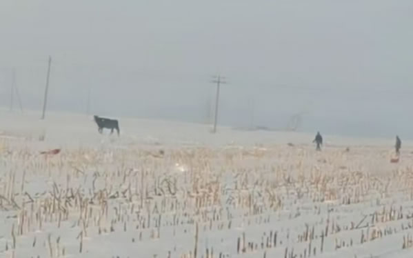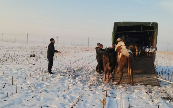 民警了解情況后為了避免瘋牛在村屯里傷害群眾,便立即組織人員開車拿著棒子等工具將瘋牛趕到了屯后的大地里。工作人員幾次試圖靠近瘋牛,但瘋?匆娪腥丝拷蜁蛉藳_過來,工作人員在幾次奔跑驅(qū)趕中摔倒在了雪地里。工作人員顧不上個人安危,但考慮到采取強(qiáng)攻制服瘋牛的策略勢必會造成人員損傷,經(jīng)過研究準(zhǔn)備采取智取方式制服瘋牛。經(jīng)過近一小時的忙碌后,這時瘋牛的情緒逐漸穩(wěn)定下來了。工作人員見時機(jī)成熟,慢慢的靠近老牛,并快速的拽住韁繩,將牛趕上了車。最后大伙一起將牛送回了李老漢的家中。