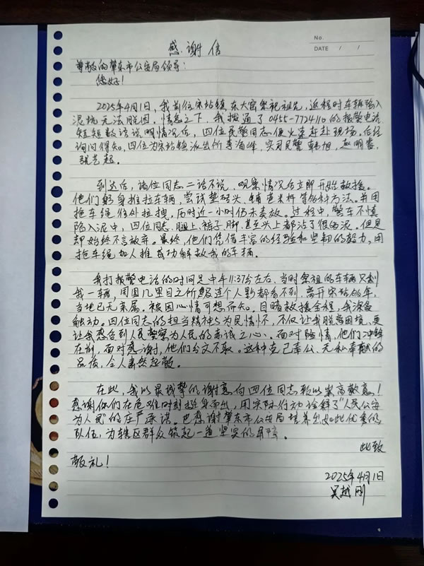 近日,肇東市公安局宋站派出所民警用實際行動書寫了為民服務(wù)的暖心篇章。民警張臨帶領(lǐng)新警張藝超、韓旭、趙明睿,成功幫助一名外地司機吳先生將陷在泥地里的轎車拖拽出來,讓司機在困境中感受到了人民警察的關(guān)懷與擔當,4月7日,群眾吳先生親自到肇東市公安局為“春苗”民警和宋站派出所民輔警送來感謝信。