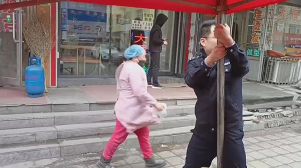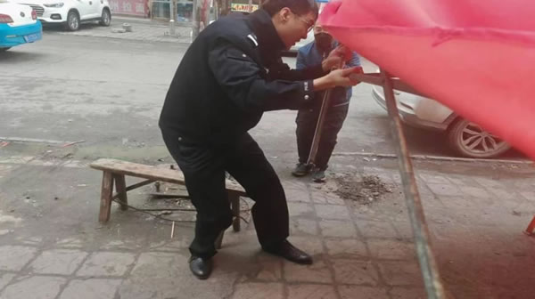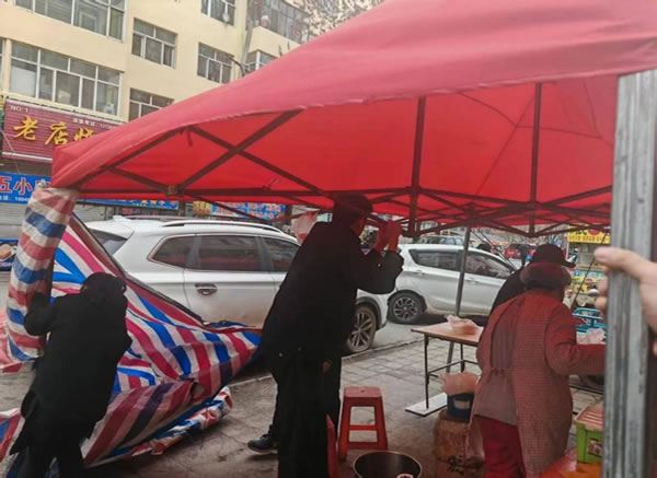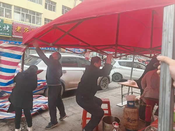 上午,副所長(zhǎng)吳復(fù)生帶領(lǐng)輔警崔曉亮巡邏至花園街一商鋪門口時(shí),發(fā)現(xiàn)其門口用于遮擋其制作油條臺(tái)子的簡(jiǎn)易帳篷在大風(fēng)中劇烈搖晃。此時(shí)老板正在帳篷內(nèi)忙碌制作油條,周圍行人不斷,帳篷一旦被大風(fēng)掀翻,后果不堪設(shè)想。見此危急情況,吳復(fù)生和崔曉亮立即快步上前。他們先安撫緊張的老板,讓其不要慌亂,隨后兩人齊心協(xié)力,在狂風(fēng)中艱難地將帳篷收起。盡管大風(fēng)呼呼作響,吹得他們站立不穩(wěn),但二人始終沒有放棄。