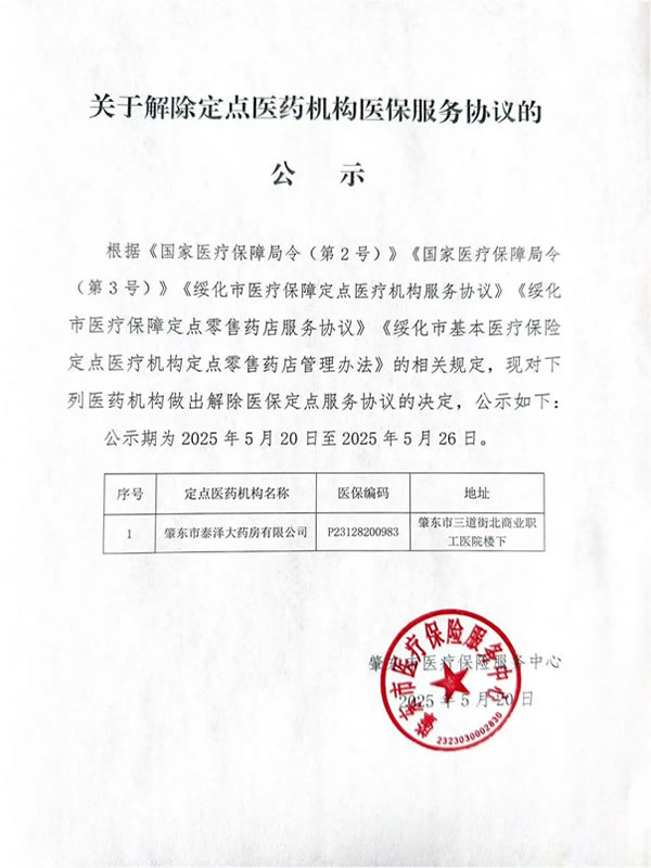 關(guān)于解除定點(diǎn)醫(yī)療保險醫(yī)保服務(wù)協(xié)議的公示