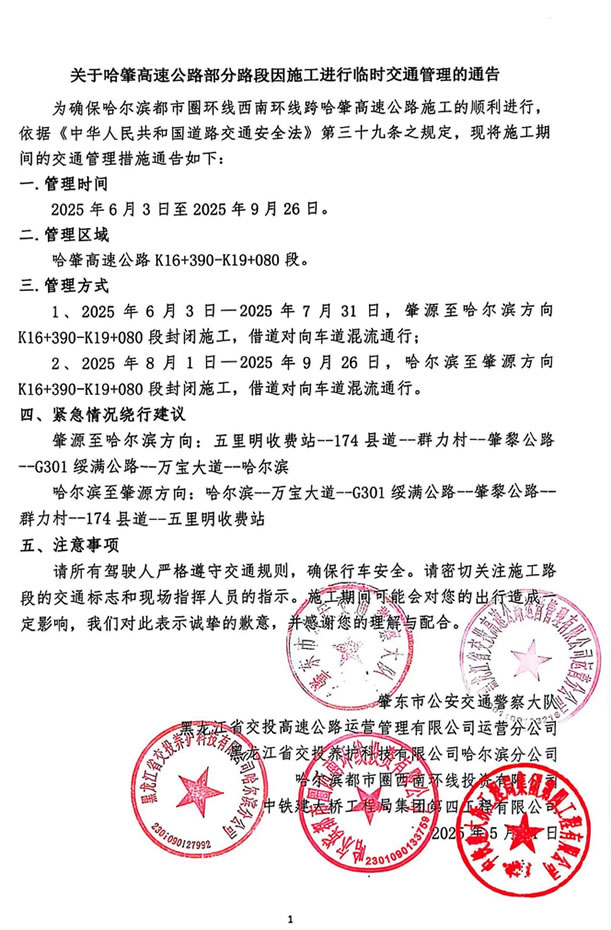 關(guān)于哈肇高速公路部分路段因施工進行臨時交通管理的通告