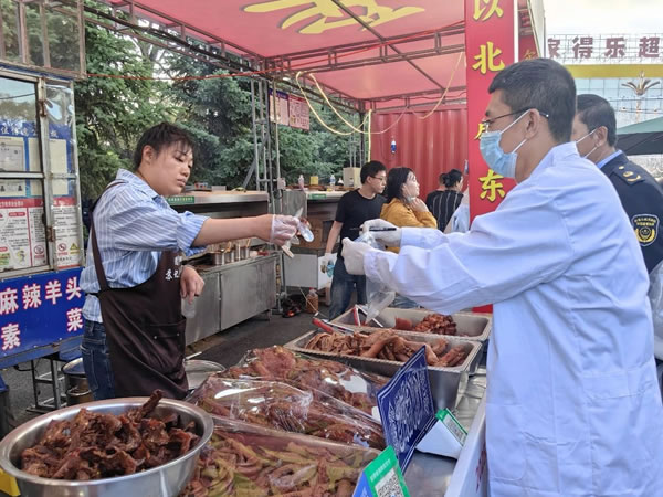 截至目前,市場監(jiān)管局共發(fā)放攤位信息公示板144個、《誠信經(jīng)營承諾書》144份。共采樣食材118批次,品種包含肉串、豆制品、海鮮、烤餅、面筋、面條、熟食、無骨雞爪、雞脖、雞排、雞柳、米糕、果蔬、蛋堡等,檢驗(yàn)項(xiàng)目包括亞硝酸鹽、瘦肉精、硫酸鋁鉀、甲醛、孔雀石綠、吊白塊、過氧化值、農(nóng)殘、雙氧水、嘔吐毒素等項(xiàng)目,F(xiàn)場檢測全部合格。