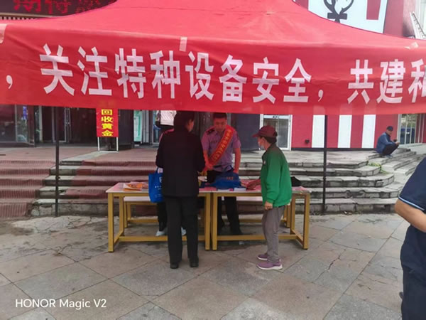 肇東市市場監(jiān)管局特種設(shè)備安全監(jiān)察股股長勾成文和特種設(shè)備監(jiān)察人員,在商業(yè)聚集區(qū)設(shè)立宣傳臺,懸掛宣傳橫幅,發(fā)放相關(guān)宣傳資料,向過往群眾宣貫《中華人民共和國特種設(shè)備安全法》、《黑龍江省電梯安全條例》、《電梯維護(hù)保養(yǎng)服務(wù)規(guī)范》等相關(guān)法律法規(guī)和安全使用知識。現(xiàn)場解答群眾提問、為群眾普及知識,答疑解惑,引導(dǎo)群眾積極參與特種設(shè)備安全群防共治,切實(shí)提高群眾特種設(shè)備安全意識和應(yīng)急防范能力。