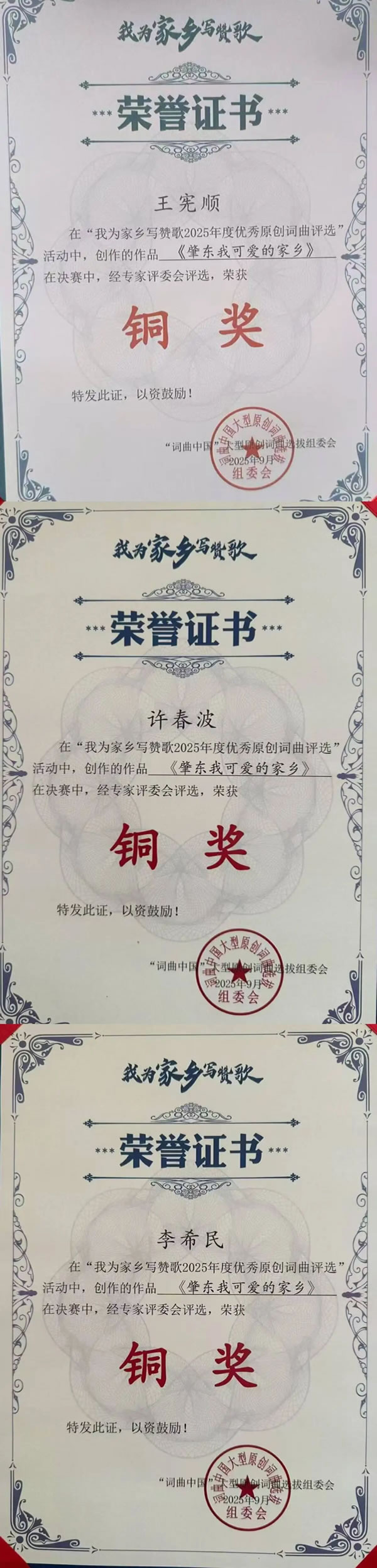 近日,“我為家鄉(xiāng)寫贊歌2025年度優(yōu)秀原創(chuàng)詞曲評選”全國決賽落下帷幕,肇東本土創(chuàng)作團(tuán)隊交出亮眼答卷——由王憲順、許春波作詞,李希民作曲的《肇東我可愛的家鄉(xiāng)》憑借濃郁的地域風(fēng)情與動人的情感表達(dá),成功斬獲銅獎。