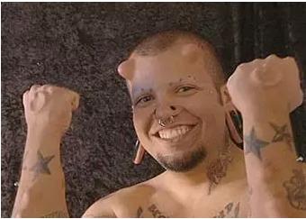 美國(guó)有位路易桑切茲的兄臺(tái),為了讓自己看起來像一頭小牛,也是在自己的額頭做功課,愣是移植了兩只“角”,不只如此,他還給自己裝了耳環(huán)和鼻環(huán)。要是“犄角”再長(zhǎng)一些點(diǎn),加上一個(gè)假頭套,活脫脫就是西游記里跳出來的牛魔王。
