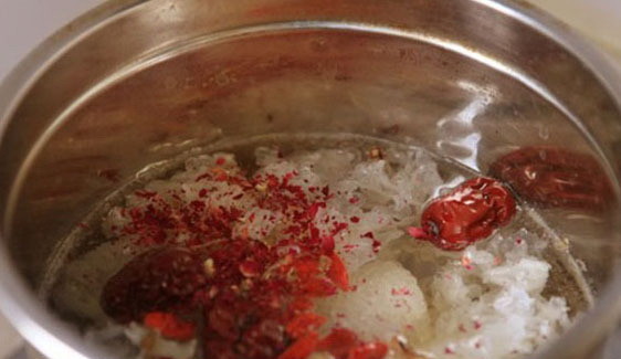 銀耳最好先在水中泡15分鐘,選材不要超級(jí)白的銀耳,銀耳不是約白越好,把所有的輔料都丟進(jìn)鍋里就好了。